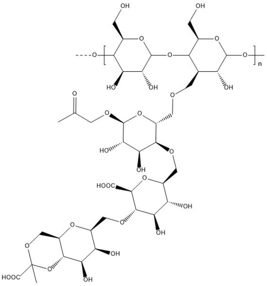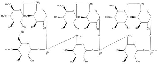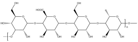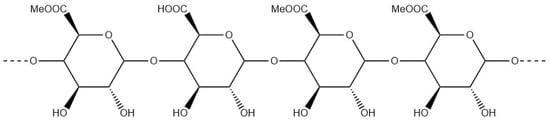 Pectins (Figure 14) are characterised by a complex mixture of anionic water-soluble polysaccharides [94]. Pectins are extracted from the cell walls of fruits such as lemon peel and apple pomace. The main component of pectins is homogalacturonan; the ratio can reach 65% depending on the type of extraction. This linear polysaccharide is composed of d-galacturonic acid units [4].