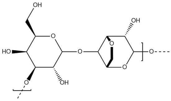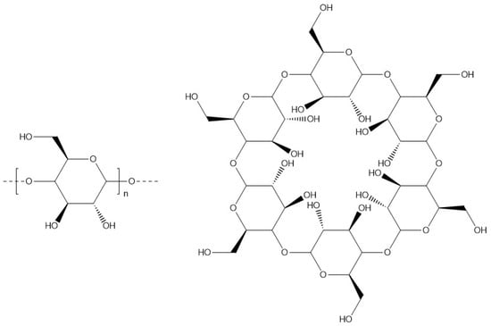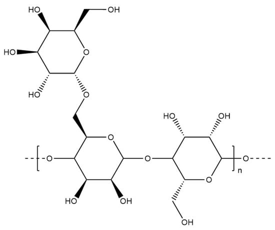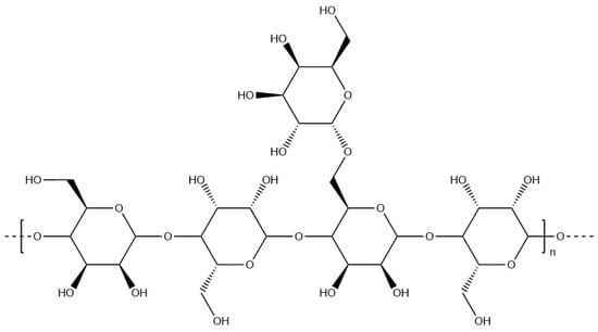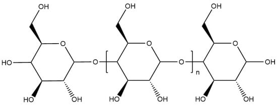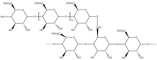 Mainly extracted from potatoes, maize, and wheat, starch is a biopolymer composed of two non-ionic polysaccharides: amylose and amylopectin [99]. It is an inexpensive and non-toxic alternative for encapsulating molecules or microorganisms such as bacteria, fatty acids, and active ingredients for pesticide, herbicide, and fungicide applications [11]. Amylose (Figure 15) is a natural polysaccharide composed of 20 to 20,000 α-D-glucose units [100,101]. Amylopectin is a branched polysaccharide composed of α-D-glucose units, consisting of approximately 2 million units with a backbone of branched short chains between 20 and 30 α-D-glucose units. The ratio is between 20 and 30% for amylose and 70–80% for amylopectin, the two ratios depend on the origin of the starch [100].
