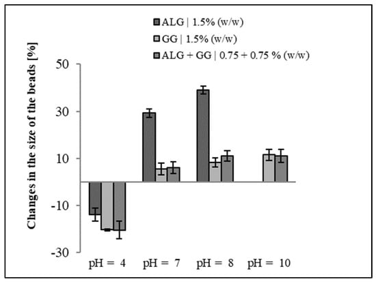 Due to the carboxylate functions, the alginate polymer matrix undergoes morphological and chemical changes at different pH values. Above pKa 4.4, electrostatic repulsion leads to expansion of the matrix, in contrast to pHs below pKa 3.4, which promote shrinkage of the cross-linked network [91,92]. Pure alginate capsules are characterised by low mechanical properties, which can be improved by blending alginate with other biopolymers [87]. In the food industry, alginate microparticles have been used as carriers for probiotics of the genus Lactobacillus, including L. plantarum, L. acidophilus, and L. reuteri. The encapsulation process by extrusion not only protected the probiotics against unfavourable conditions in the digestive tract but also improved their viability and increased their survival rate [93].