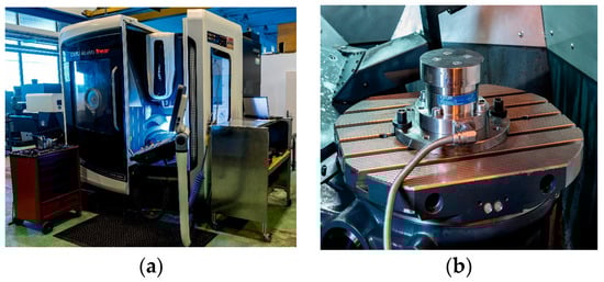 The considered technological parameters were set as constant factors regarding the concept (principle) of the performed experiment. Namely: machine—DMU eVo40 linear (DMG, Bielefeld, Germany) (Figure 4a); workpiece (stock)—Ø 118 × 30 mm—ground; tool fixture—hydro plastic fixture with exchangeable housing for tools of diameters ranging from 8 to 12 mm; dynamometer (workpiece clamping)—dynamometer Kistler 9272 (Kistler, Winterthur, Switzerland), with the workpiece clamped to the landing surfaces of the dynamometer by screws with a conical head (Figure 4b).
