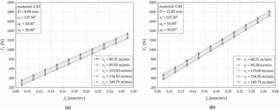 As shown in Figure 8, the value of the response Ff conditionally increases with increasing the feed (fn). This increase in the value of Ff has a significantly non-linear character (compared to the observed dependence when drilling the C45 at the same cutting conditions (Figure 6a). When setting the drill diameter D = 8 mm and constant cutting conditions as seen in Figure 8a, setting the cutting speed vc = 80.21 [m·min−1] and simultaneously increasing the feed fn [mm·rev−1] from the values set {0.09, 0.11, 0.13, … }, the Ff consequently decreases {170.353N, 390.196N, 586.074N, …}, and the relative increase in the Ff gradually acquires corresponding values {129.051%, 50.200%, …}. Further increasing the feed causes an increase in the Ff, but the relative increase between the two adjacent applied feed values (Figure 8a) decreases (from 29.333% at fn = 0.13 mm·rev−1 to 2.236% at fn = 0.27 mm·rev−1). The nature of the value changes in the response when varying the feed is similar for the applied cutting speeds vc = 95.50 m·min−1 and vc = 134.50 m·min−1, but the gradual value change in Ff is less significant. The change in the investigated functional dependence (Ff on fn) is observed at the applied cutting force vc = 149.79 m·min−1. The effect of fn on the Ff at each applied level of the cutting speed vc can be divided into two areas. When increasing the cutting speed within the defined range (Figure 8a), the conditional change in the Ff value has a non-linear character, but increases within the interval (0.09, 0.17) of the feed fn [mm·rev−1] and decreases within the interval fn ∈ (0.19, 0.27). For example, increasing the cutting speed from vc = 80.21 m·min−1 to vc = 95.50 m·min−1, the value of Ff decreases from 1286.205 N to the value of 1253.667 N (−2.530%). When applying the drill diameter D = 12 mm, the cutting conditions presented in Figure 8b, and varying the cutting speed vc at five defined levels, similar trends in the conditional response values are observed (non-linear character of the plotted curves), and there are differences in the absolute (and relative) value changes in the observed response (the feed force Ff). The individual acquired values, as well as the percentage expressions of the increases/decreases in response values, are available on request from the authors.