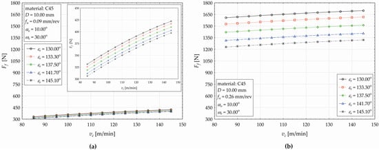The effect of the cutting speed (vc) and the point angle (εr) on the change in the value of response Ff for the drilled material C45 when setting (a) fn = 0.09 mm·rev−1 and (b) fn = 0.26 mm·rev−1.