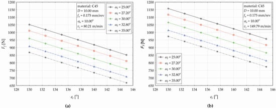 As seen in Figure 7, the response value (Ff) conditionally decreases with an increasing the point angle value (εr), and in addition, at higher values of the helix angle, the feed force values are lower. When setting the cutting speed vc = 80.21 m·min−1, helix angle ωr = 25°, and simultaneously increasing the point angle εr in the values set {130.00°, 132.5°, 135°,145°}, the Ff consequently decreases {1051.701 N, 1018.350 N, 984.999 N, 851.595 N}, and the relative decrease in the Ff gradually acquires corresponding values {3.171%, 3.275%, etc.}. The total decrease in the feed force, when increasing the point angle from εr = 130.00° to εr = 145.00°, represents 19.027%. There is the conclusion that, at the listed values of the cutting speed and the angle, when the point angle increases by 1° (within the interval from εr = 130.00° to the 145.0°), the conditional value of the feed component of the cutting force decreases by 1.268%. At the cutting speed of vc = 149.79 m·min−1 (Figure 7b), the same trends are observed.