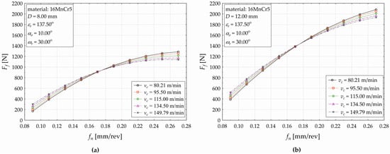The impact of feed fn and cutting speed vc on the change in the value of the feed force Ff for the drilled material 16MnCr5 using drill diameter of (a) D = 8 mm and (b) D = 12 mm.