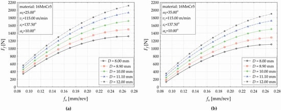 The effect of the feed fn and the drill diameter D on the changes in the feed force (Ff) values for the drilled material 16MnCr5 when applying helix angle (a) ωr = 25.00° and (b) ωr = 35.00°.