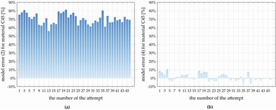 In general, based on the curves presented in Figure 6, it is possible to conclude for the drilled steel C45 that the response value (Ff) conditionally increases with an increasing cutting speed (vc), and in addition, at higher values of the point angle εr, the feed force values are higher. Of course, we can see differences in the course of the plotted functions for different feed settings, as at fn = 0.09 mm·rev−1 (Figure 6a), the non-linear change in the feed force Ff is more pronounced than that at fn = 0.26 mm·rev−1 (Figure 6b). Let us evaluate the dependence of Ff on the changing cutting speed vc for each setting of the point angle εr. When setting εr = 130.00°, the Ff values are the highest and the relative increase in Ff with an increasing cutting speed vc has a decreasing tendency. Specifically, during the drilling of C45 steel, if we increase vc by 5.00 m·min−1, starting from 85.00 m·min−1 and then vc ∈ {90, 95, …, 145}, the Ff acquires corresponding values starting from 331.187 N and then Ff ∈ {340.690, 349.844, …}, and the relative increase in the value of Ff gradually reaches values from the set {2.869%, 2.687%, …, 1.361%}. Therefore, when the cutting speed vc is increasing, the conditional relative increase in the value of the feed component of the cutting force (Ff) is not linear, it has a decreasing tendency. The average increase in Ff represents 2.045%, and the application of model (4) makes it possible to conclude that, when increasing vc by 1.00 m·min−1, the value of Ff increases by 0.034%. For εr = 130.00°, the relative changes (increases) in the Ff values with an increasing cutting speed vc fluctuate from 2.917% (vc = 90.00 m·min−1) to 1.379% (vc = 45.00 m·min−1). The average increase in the Ff values represents 2.076%. As the value of the point angle εr increases, the average increase in the feed force Ff also increases, depending on the change in the cutting speed, namely by 2.116% (εr = 137.50°), by 2.159% (εr = 141.70°), and by 2.194% (εr = 145.10°). Let us analyze the plotted functions in Figure 6a in the horizontal direction, i.e., for the chosen value of cutting force vc, let us analyze the changes in Ff when changing the point angle in a basic plane. When setting vc = 85.00 m·min−1 and simultaneously varying the point angle εr within the values set {130.00°, 133.30°, 137.50°, 141.70°, 145.10°}, the relative decrease in the value of Ff gradually acquires corresponding values from the set {1.650%, 2.136%, 2.182%, 1.806%}. For example, it stands that an increase in the point angle from εr = 133.30° to the level of εr = 137.50° causes a relative decrease in the feed force Ff by 2.136%. For example, at vc = 90.00 m·min−1, the relative decrease in the value of Ff is by 1.604% (εr = 133.30°) and 1.725% (εr = 145.10°), while the maximum value decrease is by 2.119% for εr = 141.70°. The average relative decrease in Ff conditionally depends on the varying point angle εr ranges from 1.944% (vc = 85.00 m·min−1) to 1.515% (vc = 145.00 m·min−1).