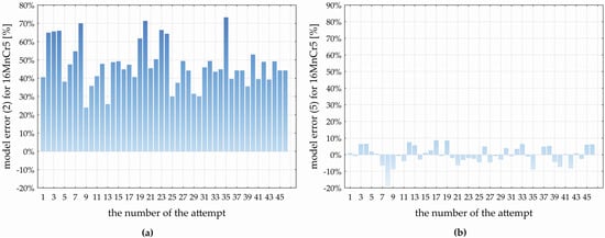 As seen in Table 11, the most significant coefficient of the regression model predicting the feed force Ff for the drilled material 16MnCr5 is Intercept (b0) with an influence of 45.558% (lower by 3.590% in comparison to the effect of b0 for C45). All effects that might have significant influence on the Ff value might be included in b0, but within the performed experiment, they were set as constant factors (see Table 4). We evaluated the impact of the explanatory variables (Table 5) as the main effects, i.e., without consideration of the Intercept (b0). Based on the estimation of the regression coefficients, the application of DOE transformation [], and subsequent modification, the prediction model of the feed component of the cutting force Ff (influenced by D—x1, fn—x2, vc—x3, εr—x4, αo—x5, and ωr—x6) for the drilled material 16MnCr5 was developed and can be written by Formula (5) as follows: