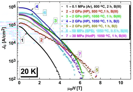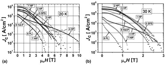The typical dependences of the critical current density, Jc, on an external magnetic field at 20 K and 30 K are presented in Figure 1. Figure 1 presents the highest values found in the literature for bulk MgB2-based materials prepared by different methods. These samples were prepared using different initial types of amorphous B and MgB2 powders, both without and with the addition of SiC, Ti, and Ta in the amount of 10 wt%, and using boron into which some carbon was specially added during preparation, B(II). The improvement of the critical current density was achieved by the application of a higher manufacturing pressure or a higher pressure of cold compaction (in the case of the following pressureless synthesized samples). The various technologies and initial materials provided the highest critical current density for different ranges of magnetic field and temperature. For example, at 20 K, the sample 1 HP possessed the highest critical current density in relatively low fields, <5 T, it was 4 HP—in a higher field, >5.5 T (Figure 1a). The typical characteristics of MgB2-based samples prepared without additions from Mg:2B and MgB2 under different conditions were summarized from [98,103,108,119] and are presented in Table 2.