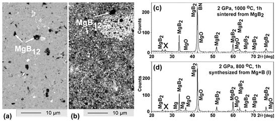 (a,b)—Sample structures obtained by SEM in COMPO (compositional) contrast: (a)—Sample sintered from MgB2 (Type VI) under 2 GPa at 1000 °C for 1 h; bright small zones in (a) seem to be inclusions (containing O, Zr, Nb, and possibly ZrO2) appearing due to milling of initial MgB2. (b)—Structure of sample synthesized from Mg(I):2B(I) under 2 GPa at 800 °C. (c,d)—X-ray patterns of these samples, respectively [109].