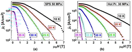 Critical current density, Jc, vs. magnetic field, μoH, of MgB2 prepared (a) from Mg(I):2B(III) by SPS under 50 MPa at 600 °C for 0.3 h and then at 1050 °C for 0.5 h and (b) from Mg(I):2B(III) + 10 wt% Ti by HotP under 30 MPa at 1000 °C for 15 min [119].