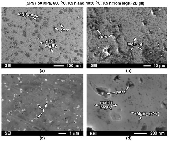 Structures of MgB2 materials prepared from Mg(I):2B(III) mixtures under 50 MPa at 600 °C for 0.5 h and then at 1050 °C for 0.5 h. Images were obtained using SEM at different magnifications [109]; (a–c)—SEI and, (d)—BEI.