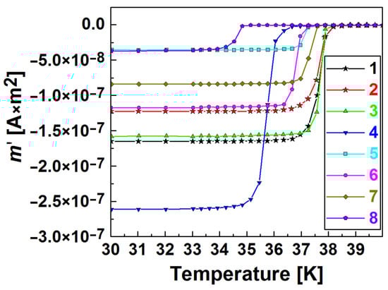 Real (m’) part of the ac susceptibility (magnetic moment) vs. temperature, T [108]. Small samples for the study were cut from superconductors prepared under 2 GPa. 1—edge of block 63 mm in diameter, prepared from Mg(I):2B (I and III) + 2 wt% Ti, at 800 °C; 2—center of the same block; 3—block 63 mm in diameter, Mg(I):2B(III) at 950 °C, 4—tablet 9 mm in diameter, Mg(I):2B(V) + 10 wt% Ti, at 1050 °C; 5—tablet 9 mm in diameter, Mg(I):2B(III) + 10 wt% Ti, at 800 °C; 6—tablet 9 mm in diameter, Mg(I):2B(III) + 10 wt% Ti at 1050 °C; 7—tablet 9 mm in diameter, Mg(I):2B(III) + 10 wt% Ta, at 1050 °C; 8—tablet 9 mm in diameter, Mg(II):2B(II) at 600 °C.