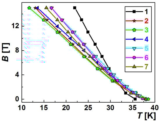 Thermal dependence of the upper critical magnetic field, Bc2, of bulk MgB2 [120,132], prepared from: 1—Mg(II):2B(II) under 2 GPa (HP) at 600 °C for 1 h; 2—Mg(I):2B(III) (30 MPa (HotP), 800 °C, 2h); 3—Mg(I):2B(III) (50 MPa (SPS), at 600 °C for 0.3 h and then at 1050 °C for 0.5 h); 4—Mg(I):2B(III) (2 GPa (HP), 900 °C, 1 h); 5—Mg(I):2B(V) + 10 wt% Zr (2 GPa (HP), 800 °C, 1 h); 6—Mg(I):2B(V) + 10 wt% Ti (2 GPa (HP), 800 °C, 1 h); 7—Mg(I):2B(I) + 10 wt% SiC (2 GPa (HP), 1050 °C, 1 h).
