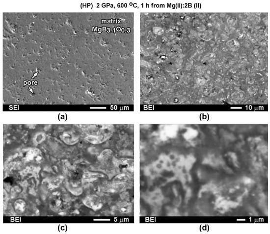 (a–d)—Microstructures obtained by SEM at different magnifications of MgB2 material prepared from Mg(II):2B(II) mixtures under 2 GPa at 600 °C for 1 h [109]. (a)—SEI and, (b–d)—BEI.
