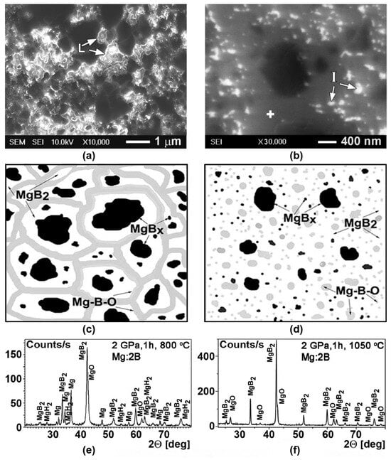 (a,b)—SEM images in SEI mode of MgB2 materials synthesized from Mg(I):2B(III) mixtures under 2 GPa, for 1 h at 800 and 1050 °C, respectively [109]. (c,d)—Schema of MgB2-based material structures synthesized at low temperature of 800 °C (e) and high temperature of 1050 °C (f) [85]. (e,f)—X-ray patterns of samples shown in (a,b) [113].