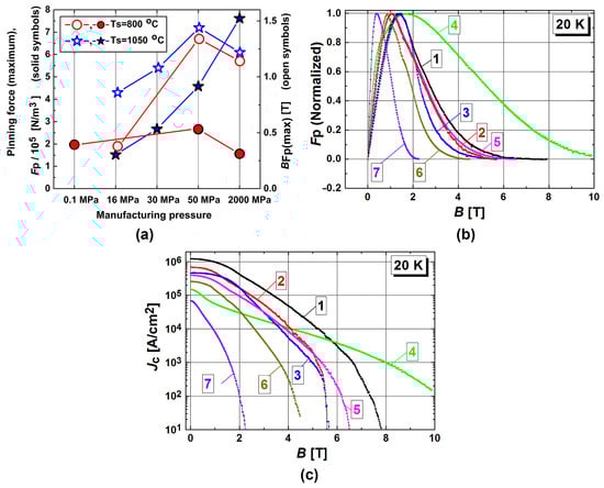 Figure 11a shows the typical dependences of the maximal pinning force and field, Bn, at 20 K on the manufacturing pressure and temperature. At the low temperature (800 °C), there is the maximum volume pinning force at a manufacturing pressure of 50 MPa. At the high temperature (1050 °C), this force increases monotonically with the pressure [128]. An increase in pressure (up to 2 GPa) usually leads to a reduction in porosity (from 47% to 1%) and, as noted above, to an enhancement of the critical current density. Fp(max) is also increased by the addition of Ti or SiC, both in the low- and the high-temperature synthesized materials (Table 3). The pinning forces in the in-situ prepared samples are higher than those in the ex-situ ones. The position of Fp(max) shifts to higher magnetic fields with the manufacturing pressure and due to the addition of Ti or SiC. A shift has also been observed in the case of using the in-situ preparation (compared to the ex-situ) [98]. The pinning type GBP dominates in the materials prepared at low temperatures (600–800 °C), while the high-temperature preparation results mainly in PP or intermediate behavior, so-called mixed pinning (MP). Exceptions have been found for materials produced by SPS (the k values were too high for the PP mechanism). These materials contain a wide range of higher magnesium borides, MgBx (x = 4–20), within their structure [20,109,119,128].