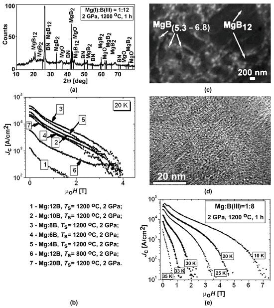 The study of the influence of boron concentration on the superconducting material properties has been performed using initial mixtures of Mg (I) and B(III) [103,108,125]. The components were mixed and milled in a high-speed planetary activator for 3 min with steel balls, and then the materials were synthesized under 2 GPa at 800 and 1050 °C for 1 h. The following mixtures were investigated: Mg(I):4B(III), Mg(I):6B(III), Mg(I):8B(III), Mg(I):10B(III), Mg(I):12B(III), and Mg(I):20B(III). The results for the critical current, Jc, and temperature, Tc, obtained by a vibrating sample magnetometer and PPMS are shown in Figure 12. Rather high critical current densities (Figure 12c,d), as well as a transition superconducting temperature of about 35 K (Figure 12b), were estimated from magnetization loops of the materials prepared from Mg(I) and B(II) mixtures, taken in Mg:8B and even Mg:20B proportions. For example, an X-ray analysis showed that a high amount of the MgB2 phase was present in materials prepared from the Mg:8B (Figure 12b,e) and Mg:12B (Figure 12a–c) mixtures. However, the study using the four-probe method allowed for the conclusion that there was no transport current flowing through the samples [103,108,125]. Figure 12d demonstrates the microstructure obtained by an TEM of a MgB12 grain, the stoichiometry of which was estimated by TEM EDX.