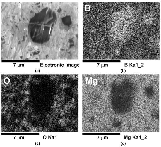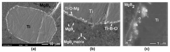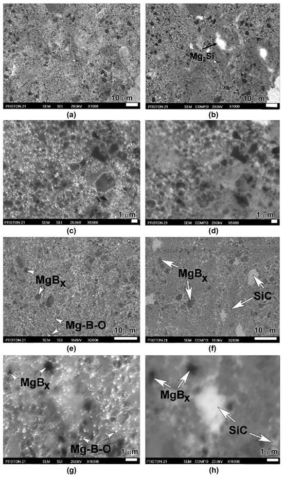 The concentration of boron in the MgBx inclusions, which are present in the MgB2 matrix, varies in a wide range. Along with the superconducting MgB2, there exist several stable, non-superconducting, higher magnesium borides (MgB4, MgB7, MgB12, MgB17, MgB20, and Mg2B25). The higher magnesium borides can crystallize in the MgB2 matrix and can affect pinning. By changing the pressure—temperature—time conditions, one can change the stoichiometry of the higher borides inclusions and the areas they occupy in the MgB2 matrix. Higher magnesium borides MgBx in the high–pressure (2 GPa) manufactured materials demonstrate x = 9–14, and mostly around 12. In spark plasma manufactured materials, the MgBx phases with x = 4–6 occupy rather porous and rather large areas, which appear as the gray areas in Figure 4a,b. Small inclusions, with x = 8–16, are also present in the material and are shown as the black areas in Figure 4. The MgBx inclusions with x= 6–8 are in the materials synthesized by the hot–pressing method. This allows for the assumption that pressure plays an essential role in the stoichiometry of MgBx inclusions of high magnesium borides. The inclusions with x = 18–25, or even pure B, appear in the structure randomly and, thus, cannot influence the material characteristics as a whole [109].
