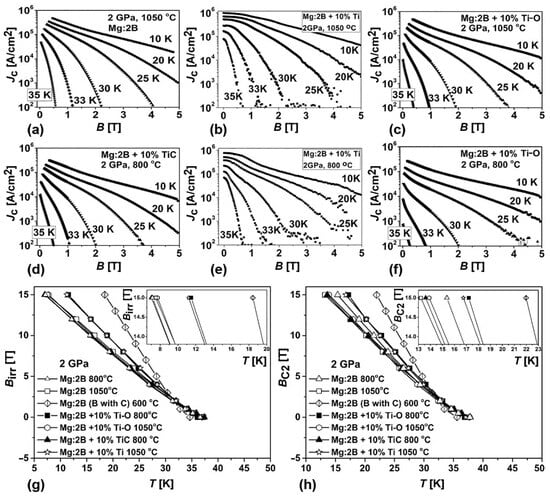As example of the manufacturing temperature influence, Figure 10 presents the critical current densities of the materials synthesized from different types of initial boron without and with Ti and SiC additions at the low (800 °C) and high (1050 °C) temperatures. One can see that the synthesis at the low temperature allows for the achievement of higher critical currents in higher magnetic fields. However, the synthesis at the high temperature leads to higher critical currents in low magnetic fields. This is observed for a temperature range from 10 to 35 K and in external magnetic fields up to 10 T [20,103,109].