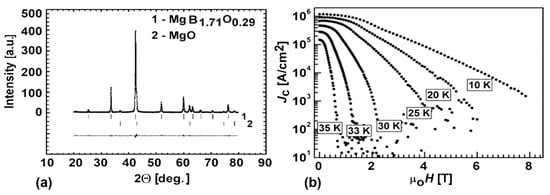 - Prikhna, T.; Eisterer, M.; Rindfleisch, M.; Ponomaryov, S.S.; Tomsic, M.; Romaka, V.V.; Moshchil, V.; Kozyrev, A.; Karpets, M.; Shaternik, A. Manufacturing. structure, properties of MgB2-based materials. J. Supercond. Nov. Magn. 2019, 32, 3115–3120. [Google Scholar] [CrossRef]