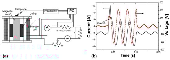 - Meerovich, V.; Sokolovsky, V.; Prikhna, T.; Gawalek, W. Measuring AC losses and critical current of high pressure synthesized MgB2 bulk rings by the transformer method. Mater. Sci. Forum 2012, 721, 27–32. [Google Scholar] [CrossRef]