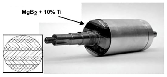 Modern progress in the development of new superconducting materials has brought the manufacturing industry to the stage of real applications. The most promising for wide application in various fields are MgB2 superconductors and high-temperature superconductors (HTS) based on rare-earth barium copper oxides and bismuth strontium calcium copper oxides [1,2,3,4,5]. This group may soon be supplemented by a class of iron-based superconducting compounds (or FeSC) [1], for which the production technologies are being intensively developed. Of all the mentioned materials, MgB2-based superconductors are the cheapest and most easily prepared for magnetic applications. The high level of superconducting characteristics of MgB2, which are very important for applications, such as critical current density, and upper critical and trapped magnetic fields, can be achieved in a polycrystalline structure due to the absence of the weak–link problem at grain boundaries [6]. The last represents the main drawback of HTS. This distinguishes magnesium diboride from HTS, which must be texturized or epitaxially grown to achieve high superconducting properties. In addition, the deviation of stoichiometry from MgB2 to a sufficiently high degree is not an obstacle to achieving a high level of superconducting characteristics [7,8,9,10,11]. The temperature of the superconducting transition of the MgB2 compound is about 39 K, depending on the isotope composition [12]. The critical temperature is lower than that of HTS, but is high enough for application in cryogenics devices in which liquid hydrogen (boiling temperature 20 K) and cryocoolers can be used for cooling.