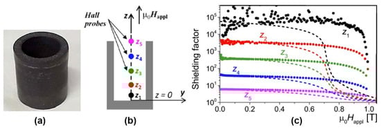 - Gozzelino, L.; Gerbaldo, R.; Ghigo, G.; Torsello, D.; Bonino, V.; Truccato, M.; Grigoroscuta, M.A.; Burdusel, M.; Aldica, G.V.; Sandu, V.; et al. High magnetic shielding properties of an MgB2 cup obtained by machining a spark plasma-sintered bulk cylinder. Supercond. Sci. Technol. 2020, 33, 044018. [Google Scholar] [CrossRef]