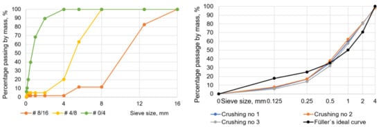 Therefore, material properties and performance of secondary raw materials as well as new materials and products must be thoroughly studied. During the literature review, the authors of this paper found earlier studies where different recycled aggregates for concrete and mortars have been studied, e.g., concrete, mortar, ceramic brick, and tiles [16]. Thorough review covering numerous use of recycled fine aggregates in a form of table is given in [17]. In the Scopus database, there were 4005 results for “recycled aggregate concrete” AND “concrete”; 146 results for “recycled aggregate concrete” AND “brick”; 59 results for “recycled aggregate concrete” AND “stone”. However, we did not find any previous publications about concrete, where fine or coarse aggregates had been replaced with recycled crushed calcium silicate brick masonry—therefore, it was carried out in this paper to create new knowledge and to discover alternative applications. Practical outcomes would be decreasing the need for primary raw materials as well as producing fewer CO2 emissions from transportation if a “donor” building is located near the construction site of a new concrete building. As elsewhere, the approach could be applied in post-war countries and regions such as Ukraine or Israel and post-disaster Turkiye and Syria.