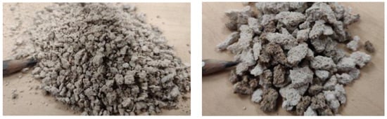 For the production of aggregates from silicate brick masonry, the water absorption of the aggregate is also an important parameter. Water absorption determines the frost resistance of the concrete and the rate of loss of consistency. The water absorption of silicate bricks was determined according to EN 771-2 [24], and the mean result was 8.1%.