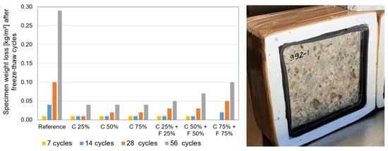 Frost resistance tests of concrete were carried out in accordance with EVS 814 [33]. Freezing and thawing of the test specimens was carried out according to the standard in a climate chamber with forced air circulation. The freezing agent on the surface to be exposed to the test was a 3 mm thick layer of distilled water. The duration of one freeze-thaw cycle was 24 h. After the number of cycles of 7, 14, 28 and 56, the loss in mass of each test specimen was determined, and the total amount of crushed material, Σ M (g), and the total loss in mass per unit area, Σ S [kg/m2], were calculated. The average mass loss per unit area of the two test specimens is given in Figure 5.