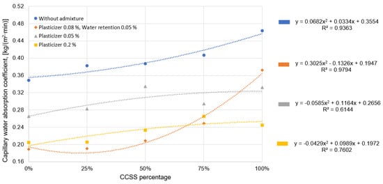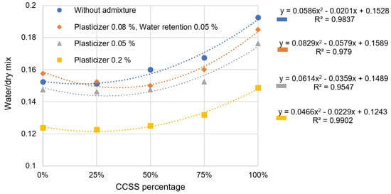 Figure 6 shows a clear trend that the more CCSS used in a mixture, the higher its water demand. This trendline can be seen in the water demand of each mixture and is consistent with the number of admixtures. Based on dry mixes without additives, the water demand of a 100% CCSS blend is about 21% higher than that of a 0% CCSS mix. This means that a mixture with only CCSS requires 1/5 times more water than a mixture with natural sand. The same result was obtained by Huang [35], Ceylan [36], Omur [37], and Fang [38], who recycled different types of crushed aggregates, which were porous and highly water-absorbent.