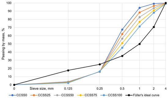 CCSS was used in mixtures in non-fractionated (all-in) form (shown as “CCSS0” in Table 4). Comparing the grain size compositions of natural sand and CCSS, the natural sand has a small amount of the 1–4 mm fraction. In contrast, the CCSS has almost 5 times as many 1–4 mm fractions. In the tested natural sand, ~30% of the weight consists of particles larger than 0.5 mm and more than half of the weight is between 0.25 and 0.5 mm. This is well reflected in the line placement and the difference in slope in the Figure 7. In CCSS, the slope is lower and the sieve curve lower, and in natural sand, the slope is higher and the sieve curve higher.