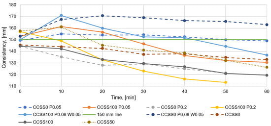 Mixtures without admixtures give a good indication of the effect of the CCSS proportion on the consistency of the mix. In order to obtain further confirmation of the issue of whether increasing the proportion of CCSS in a mixture leads to a faster loss of consistency, it is necessary to compare the effect of the proportion of CCSS in mixtures with admixtures on consistency.