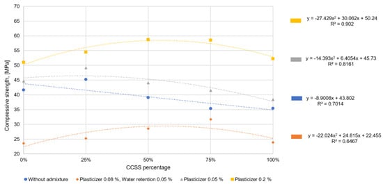 At the maximum use of the plasticizer (Figure 8), the trend lines are more similar to the mixtures without admixture, where it can be seen that mixes with 75% and 100% CCSS lose their consistency faster. Mixes made with the maximum amount of plasticizer lose consistency more quickly because there is less water in the mix for CCSS to absorb.
