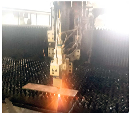 The experiments were carried out with an industrial fiber laser machine with a maximum power of 4 kW (Figure 1). The examined material is a Hardox 400 steel sheet (SSAB Steel industry company, Stockholm, Sweden) with a thickness of 8 mm. For implementing the tests, a 330 mm × 130 mm sample was prepared. The steel was provided by a certified steel supplier and the chemical composition of the Hardox 400 steel sheet is shown in Table 1.