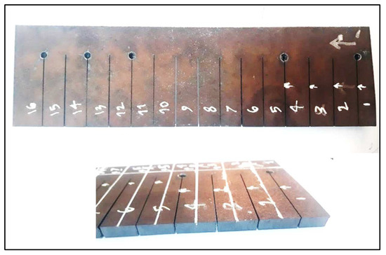 In Figure 2, the straight cuts with a length of 80 mm were made on a Hardox 400 steel sheet according to the list of experiments designed based on RSM (Table 3).