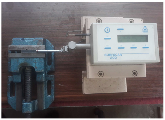 A surface roughness instrument (Surfscan200) (Surfscan, Rocklin, CA, USA) was used to measure the surface roughness (Figure 4). The nominal accuracy of this device is 0.001 µm, and the stylus probe scans the surface with 4 mm as evaluation length (0.8 mm sampling length or cut-off length × 5 sampling lengths) and 0.4 mm pre-travel and 0.4 mm post-travel lengths. The average surface roughness value (Ra) is calculated according to the ISO 21920-3:2021 standard [27]. To measure the surface roughness of the samples, the measurements were carried out in three zones of the surface for each sample. The instrument probe scans the surface roughness along the direction of the laser-scanning direction, and the average value was considered as the final surface roughness of the cutting groove.