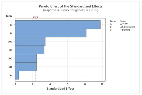 The results of the ANOVA for surface roughness are shown in Table 4. FPP and LCS are the effective parameters in the process, while LOP has the least effect. The results of the ANOVA for surface roughness are also shown graphically in a Pareto chart in Figure 5. The red line in Figure 5 is called the reference line and the variable that crosses the line is a significant parameter. It is calculated from the T-distribution function.