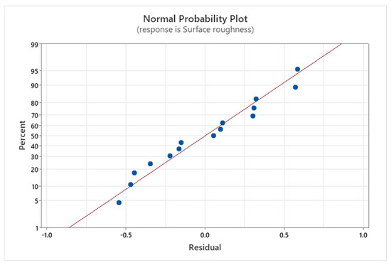 Figure 6 presents the Normal Probability Plot for the surface roughness. Observing that the data points align approximately linearly along the regression line, we can conclude that the data follow a normal distribution and that the linear regression model fits the experimental data well. The distance of points from the red line (Residual) shows the quality of interpolation, and the coefficient of determination (R2) is calculated according to the closeness of the points to the line. From Table 4 it can be reported that the R2 is 96.56% for surface roughness.