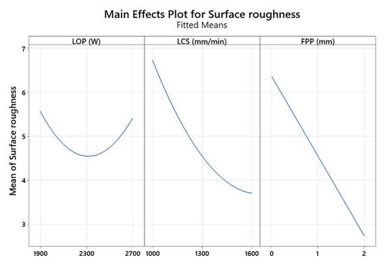 The effect of the main parameters such as LOP, LCS, and FPP on the surface roughness is shown in Figure 7. In this research, the focus position has been set between 0 and 2 mm above the surface of the sheet. As is seen in Figure 7, with the increase in laser power, the surface roughness decreases due to the entry of more thermal energy into the cutting area and complete melting in this area. Consequently, with a further increase in laser power, due to the destruction of more areas of the sheet in the cutting area, the roughness of the cutting surface increases. In addition, with increasing the LCS, surface roughness decreased. This is because the thermal energy has less time to melt the cut surface and increase surface roughness. The laser energy density should also be applied to the workpiece surface in an appropriate range and for a specified time to prevent an increase in surface roughness.