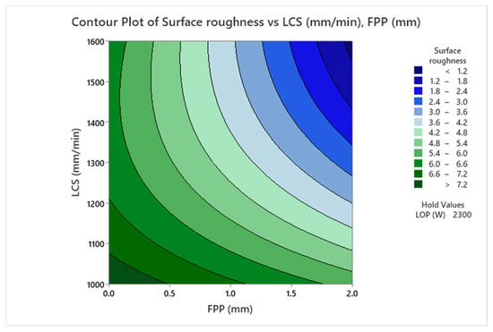 It is concluded from Figure 7 that the surface roughness is decreased with increasing the distance from the focal point of the laser beam from above the surface of the sheet. The reason is that increasing the positive focus allows the gas to react better with the melt in the front of the cut, generating additional heat in the cut gap, melting it, and moving it down the gap, resulting in a smoother surface. Figure 8 shows the contour plot of the interaction effects of FPP and LCS on the surface roughness of the cutting area of the sheet. It is found from Figure 8 that with increasing positive FPP and LCS, the surface roughness decreases. As the FPP increases, the focus of the laser’s heat beam is positioned above the workpiece, allowing the oxygen gas to react thermally with the workpiece, adding a thermal energy source to the cutting process that melts the material. With increasing speed, the molten material is expelled from the cutting groove along with the oxygen GP, improving the surface quality of the cut.