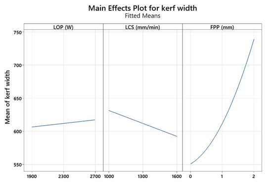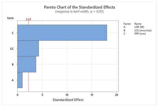 The results of the ANOVA for kerf width are shown in Table 5. FPP and LCS are the most significant process parameters affecting kerf width, while LOP has the least effect. The results of the ANOVA for kerf width are also shown graphically in Figure 9, the Pareto chart. The observed value for the coefficient of determination (R2) indicates a high degree of fit between the model and the experimental data.