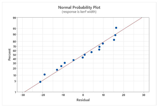 Figure 10 presents the Normal Probability Plot for the kerf width. Observing that the data points align approximately linearly along the regression line, we can conclude that the data follows a normal distribution and that the linear regression model fits the experimental data well. The coefficient of determination (R2) is 97.28% for kerf width which shows the good quality of the interpolated equation.