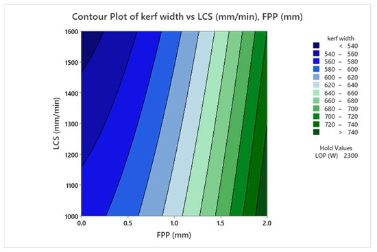 Figure 12 presents the contour plot of the interaction effects of LCS and FPP on kerf width. The interaction plot indicates that kerf width decreases with increasing the LCS and also with decreasing the positive FPP towards the sheet surface. Increasing the LCS reduces the concentration of the heat energy impact point, and the FPP approaching the cutting surface prevents the oxygen gas from having optimal exothermic reaction conditions with the workpiece, reducing the heat energy and consequently resulting in less melting in the kerf.