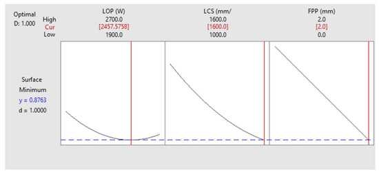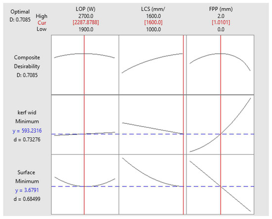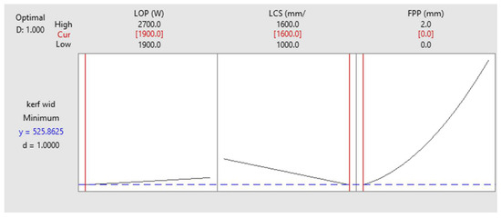 The effect of process parameters on the characteristics of the cutting area in the LCP is very complex. This complexity arises from the fact that changes in various parameters in LCP affect both surface roughness and kerf width. Figure 13 shows the optimization settings for the minimum surface roughness. The results show that if only surface roughness optimization is considered, the optimal average surface roughness is around 1 µm if the LOP is 2457 watts, the LCS is 1600 mm/min, and the FPP is +2 mm above the sheet surface.