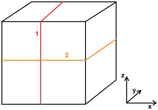 Sample cutting planes: 1—YZ plane, along the printed layers; 2—XY plane, along the direction of layer deposition.