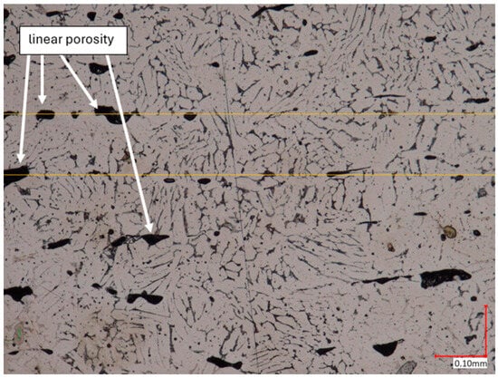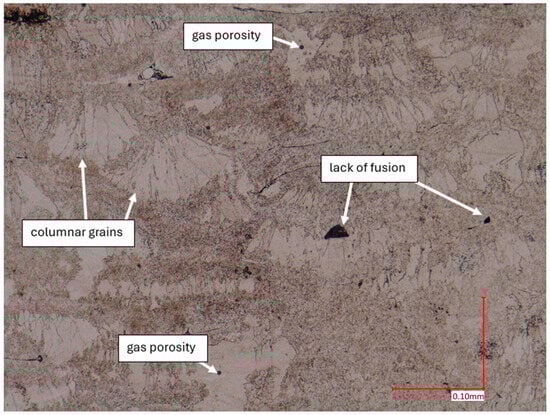 The microstructural analysis of samples produced by the MEX technique reveals the presence of void spaces with irregular shapes in both examined planes (Figure 5 and Figure 6). Notably, in Figure 5, the largest voids are observed between two adjacent deposited material paths, while the morphology exhibits a relatively regular pattern characterized by particles of uniform shapes and dimensions. Microscopic examination of samples fabricated via the PBF-LB/M method (Figure 7) unveils the existence of columnar grains, stemming from the specific crystallization kinetics during the solidification of the molten material layer in PBF-LB/M. The rapid cooling of the molten material layer induces swift solidification, resulting in the formation of these columnar grains. Additionally, the presence of voids within the structure is noted, with their irregular shapes possibly indicating localized areas of incomplete material fusion, a phenomenon often associated with the occurrence of porosity, known as lack of fusion (LOF). These findings suggest that the PBF-LB/M process engenders distinctive microstructural attributes, including orderly arranged alloy traces and potential porosity formation linked to lack of fusion. Another discernible form of porosity is linear porosity, observed at the periphery of the melt pool, attributed to the excessive spacing between successive paths traced by the laser scanner during the deposition of subsequent material layers. Moreover, circular voids akin to gas porosity are evident in microstructure images, signifying the presence of gas entrapment. This phenomenon arises due to chemical reactions occurring during the printing process or residual gas entrapment within the printed material, leading to the liberation of microscale gas pores. Such pores may arise from incomplete material fusion, inappropriate printing parameters, or chemical reactions among powder constituents. In the YZ plane (Figure 8), the structure demonstrates reduced porosity characterized by diminished void dimensions, alongside the discernible directionality of the exposure paths within the structure.