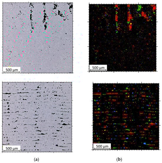 Next, using the confocal microscope Olympus 4100 LEXT OLS 4100 (Olympus, Shinjuku, Tokyo, Japan) and dedicated software (Mountains Map, version 7.0), the porosity of the samples was examined. It was calculated based on the average number of grains in each sample. For each specimen, the porosity was analyzed in the central part of the metallographic section. All visible pores were marked in both analyzed planes. Porosity quantitative analysis was based on the captured microscopic images. It was carried out using Mountains Map 6 Software.