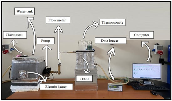 A general overview of the experimental setup is given in Figure 1. The experimental setup comprised a 20 lt stainless steel insulated water tank, a 2000 W electric water heater, a thermostat, a 3-stage 65 W pump, a flow meter with a measurement range of 2–18 lt/min, a 23 cm × 23 cm × 3 cm copper TESU, and a copper heat exchanger with a diameter of 10 mm contacting one surface of the TESU. The experimental setup also consisted of K-type thermocouples that measured the temperature from different points of the TESU and also from the inlet and outlet points of the water; a 16-channel data logger that allowed the measurement results to be obtained; and a computer where the received data were stored.