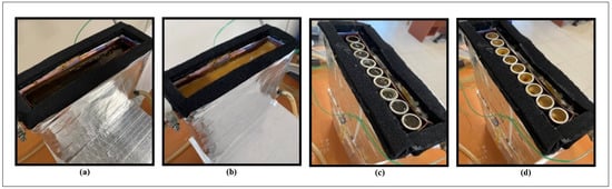 The PCMs P1 and P2 were used directly in the rectangular volume of the TESU and placed in macro-sized aluminum tubes with a diameter of 2.5 cm. Encapsulation refers to the coating of solid, liquid, or gaseous substances with a shell layer of a macro, micro, or nano size. The purpose of encapsulating PCMs is to reduce the exposure of the inner material to external influences, keep the liquid material at a specific volume during the phase change process in the solid shell, and increase the heat transfer surface. The temperatures inside the encapsulated PCMs were measured with thermocouples throughout the experiment.